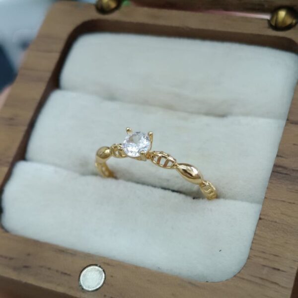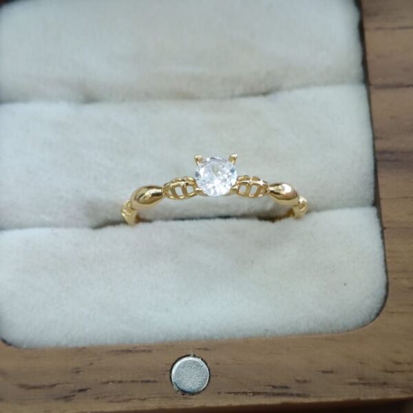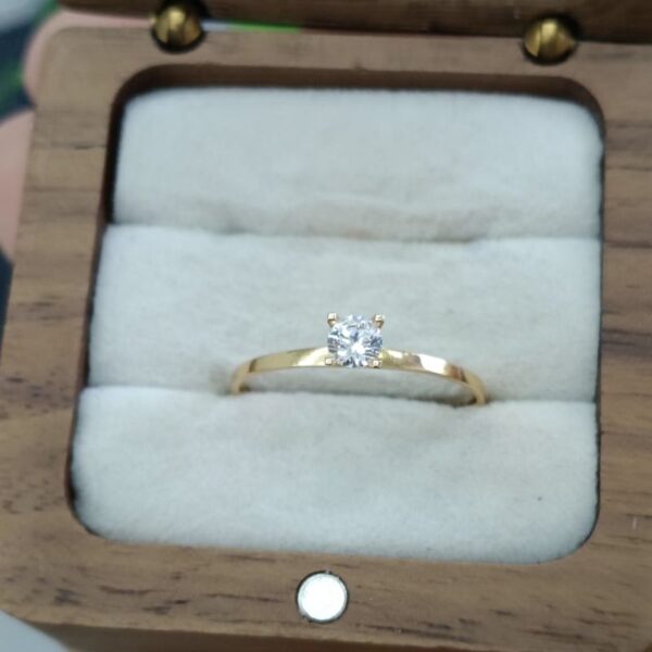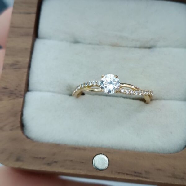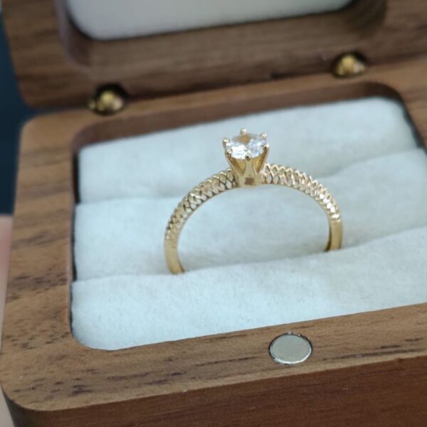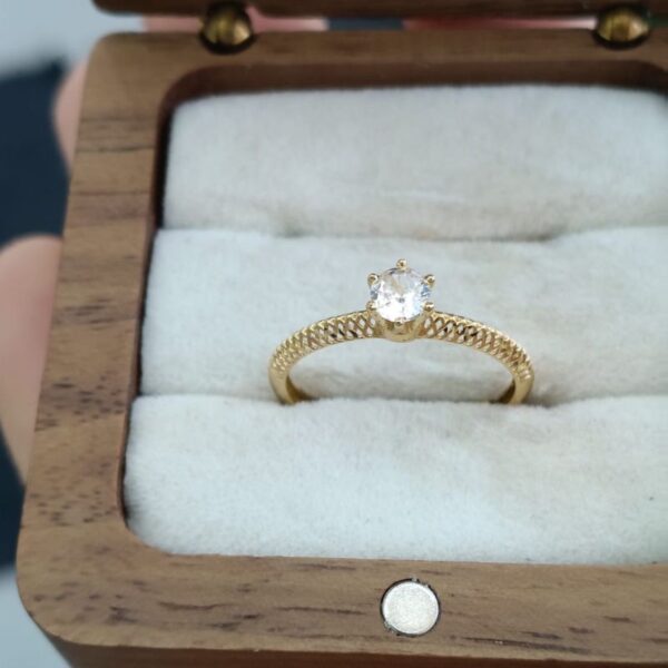 Possui um design solitário, com uma única pedra central elevada. O aro apresenta detalhes intrincados, possivelmente em estilo de filigrana ou com um padrão de folhas/elos.
