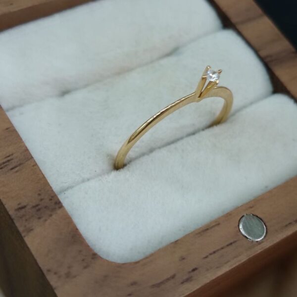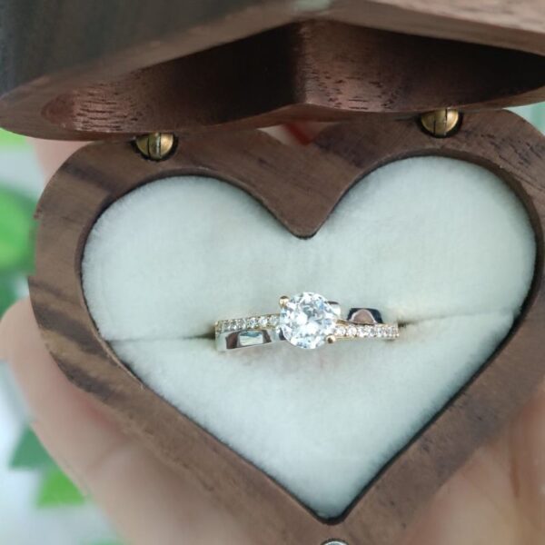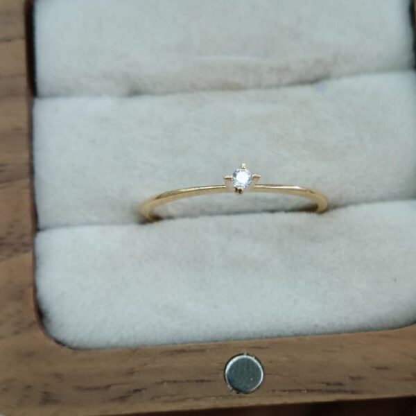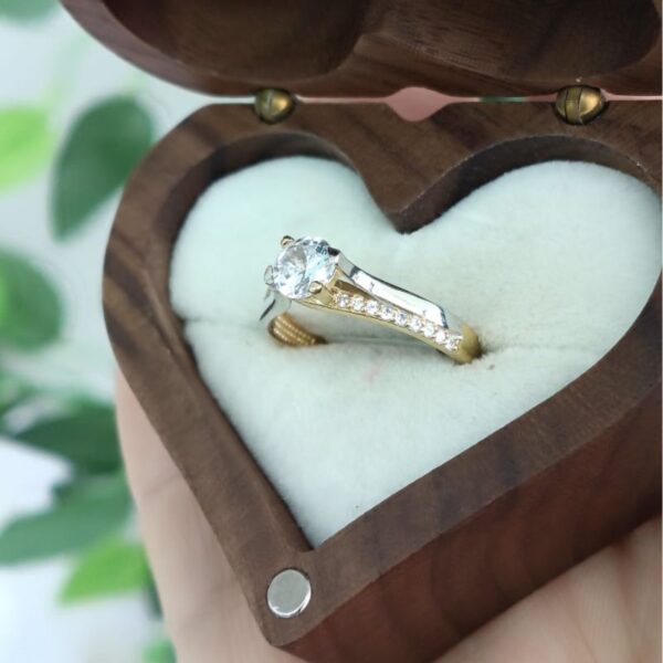 O anel possui um design clássico solitário, com a pedra principal elevada por garras
