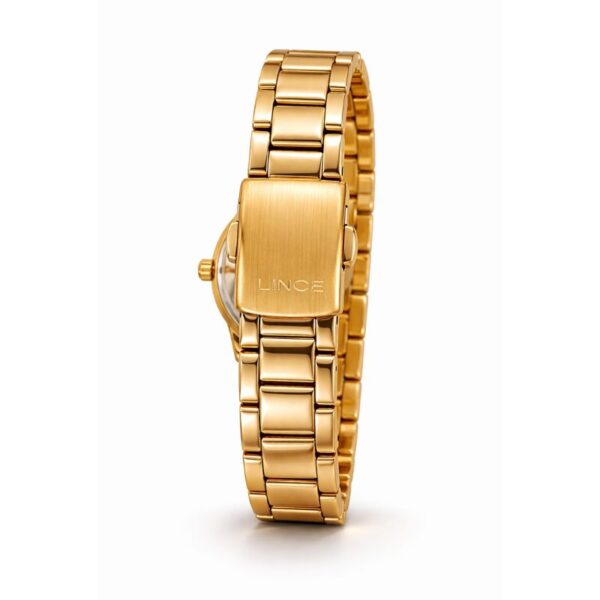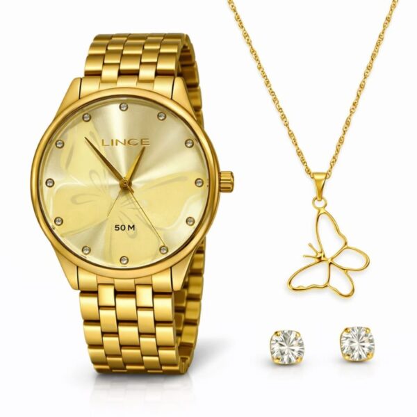 Kit Relógio Lince Analógico Dourado + Gargantilha e Brincos Luz