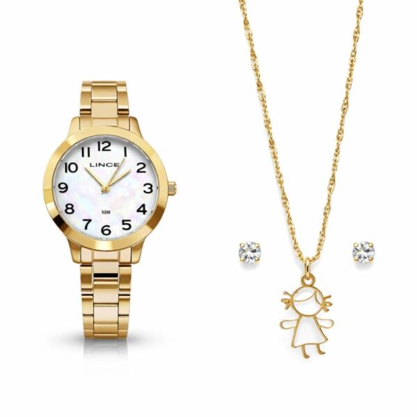 Kit Relógio Lince Analógico Dourado + Gargantilha Menina com par de brincos