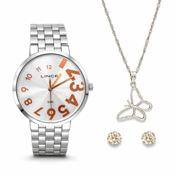 Kit Relógio Lince Analógico Prateado + Gargantilha Borboleta