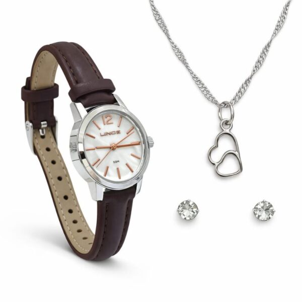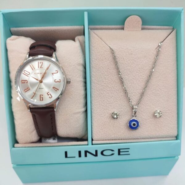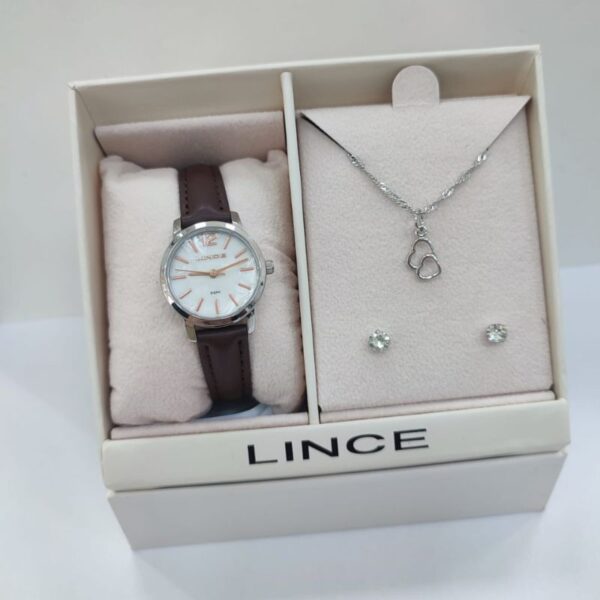 Linha kit presentes Código 027272 Referência LRCH239L39K0G1S2NX Marca : lince Gênero: feminino Mecanismo: analógico Vídro: cristal mineral Material caixa : metal Fundo : aço inoxidável Tamanho caixa : 30 Mm Mostrador :branco Modelo mostrador:numerais arábicos Estilo casual Pulseira:couro marrom Fecho : fivela Fundo : pressão Resistência 50M Acompanha colar com pingente e um par de brincos na cor prata ( material ) semijoia com banho de ródio. Garantia 12 meses Acompanha nota fiscal