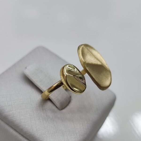 Anel ajustável Anel apresenta duas peças de formato orgânico a peça menor possui acabamento polido e a peça maior acabamento fosco Pecas de formato orgânico e irregular, semelhantes a seixos ou pedras achatas conectados por um aro