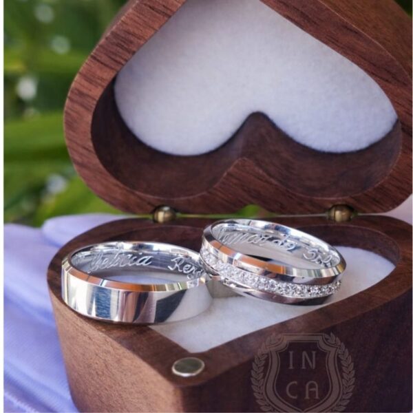 Design : chanfrada lateral Feminina rodeada de zircônias totalizando 40 pedras Peso 18g o par Largura 5 mm Semi anatômica por dentro Espessura 3.mm Gravao: cortesia Composto por : 1 par de aliança