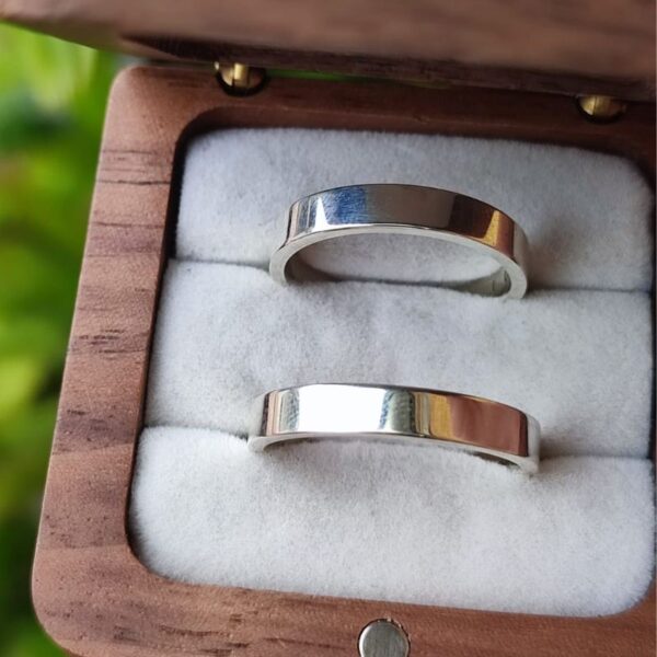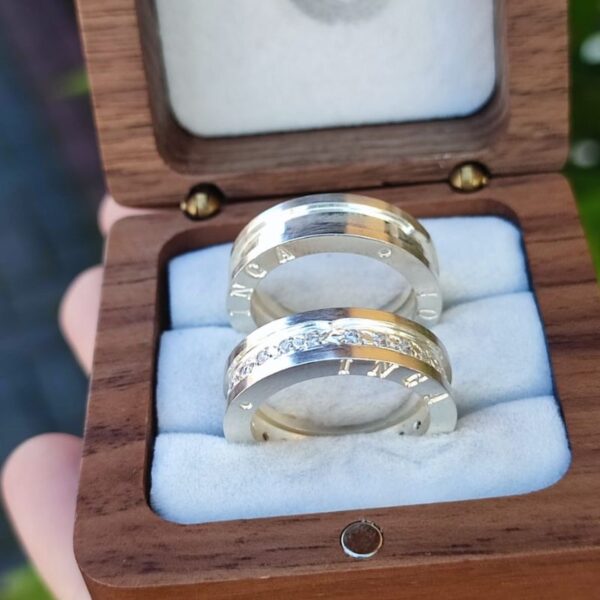 Design reta Peso 12 g o par Largura 3 mm Masculina lisa Feminina diamantada Espessura 2.mm Pedra adicional 10,00 cada Gravao: cortesia