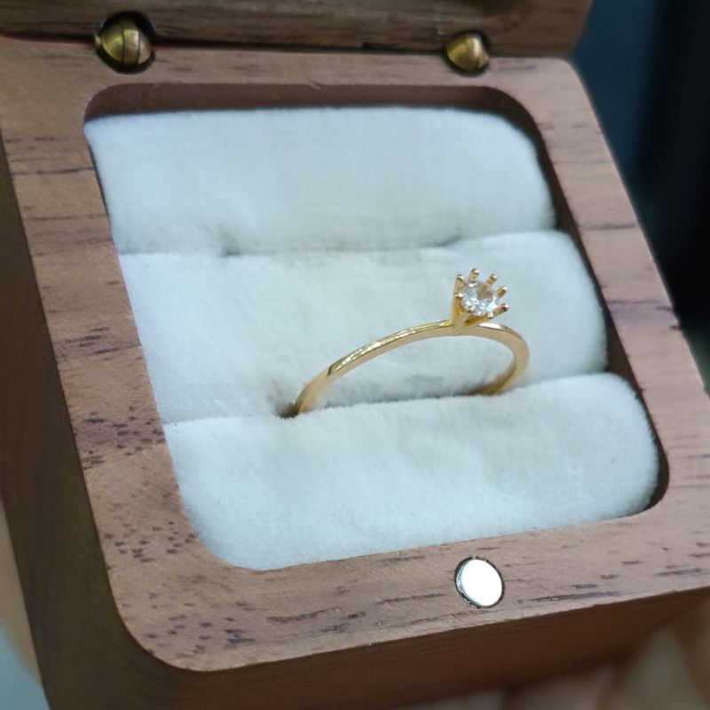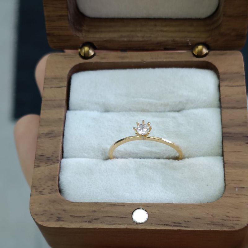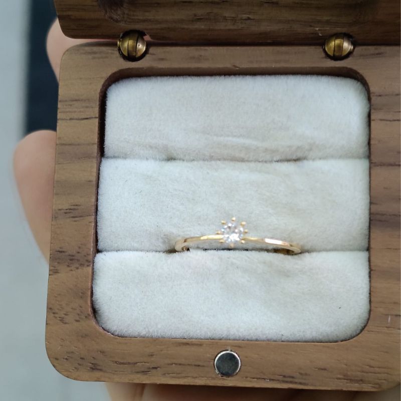 O anel possui um design clássico solitário, com a pedra principal elevada por garras