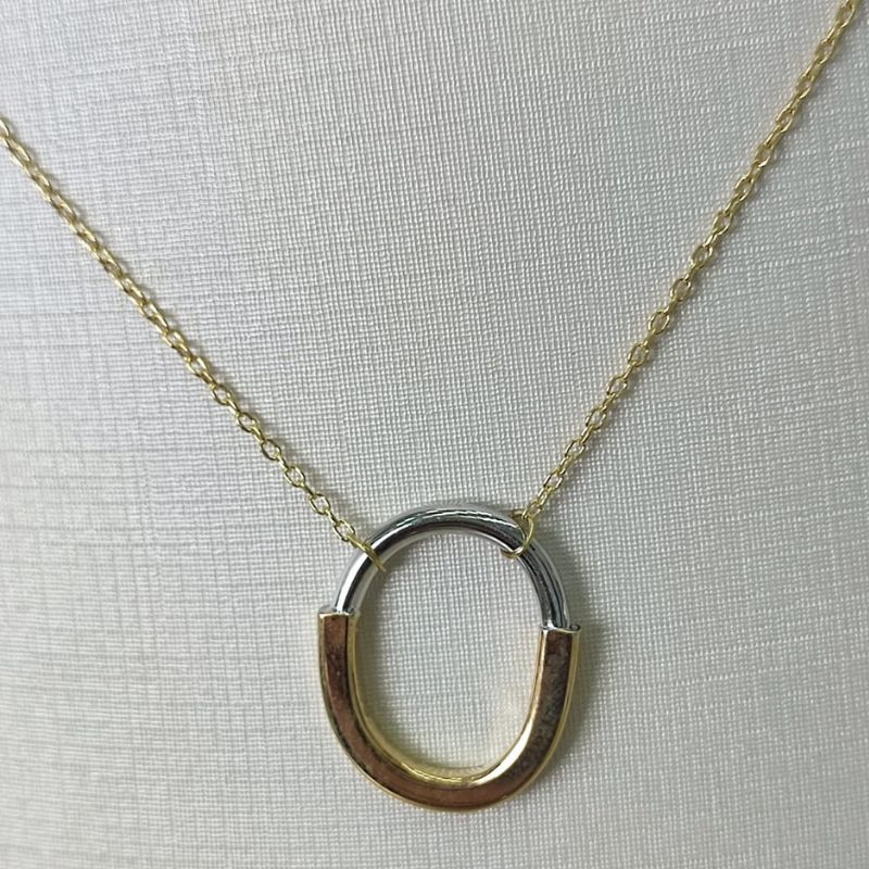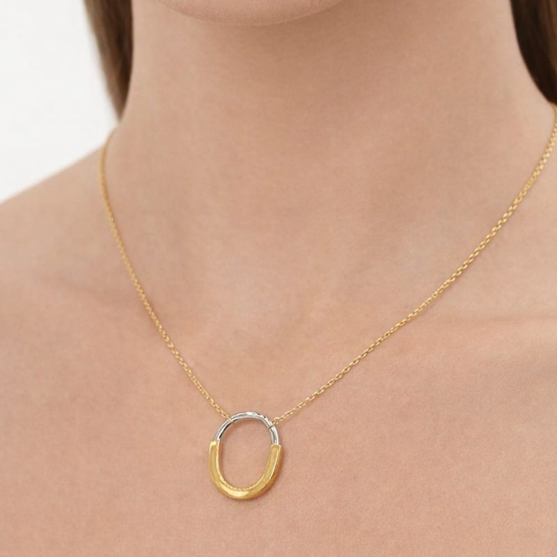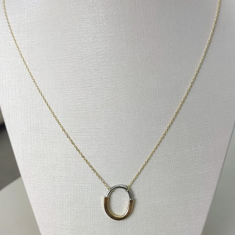 Um design moderno e elegante, com acabamento bicolor que combina com tudo. Um pingente que representa conexão e sofisticação no dia a dia.”