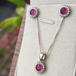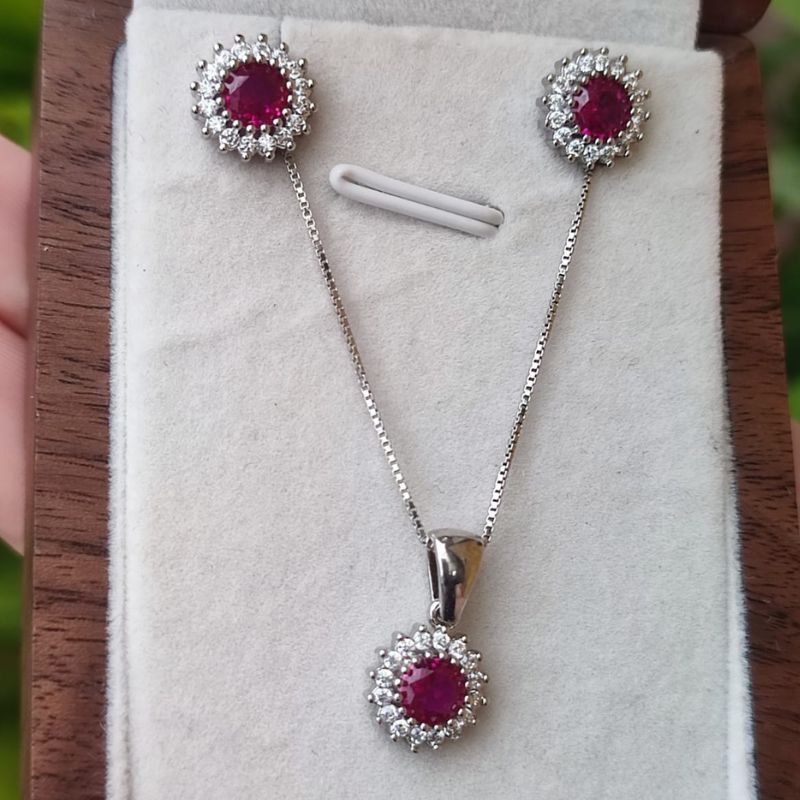 •designer :possui um design clássico e refinado, com pedras de zircônias rubi no centro, lapidadas em formato redondo. Cercadas por pequenas zircônias brancas .
