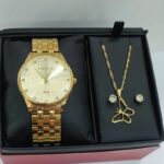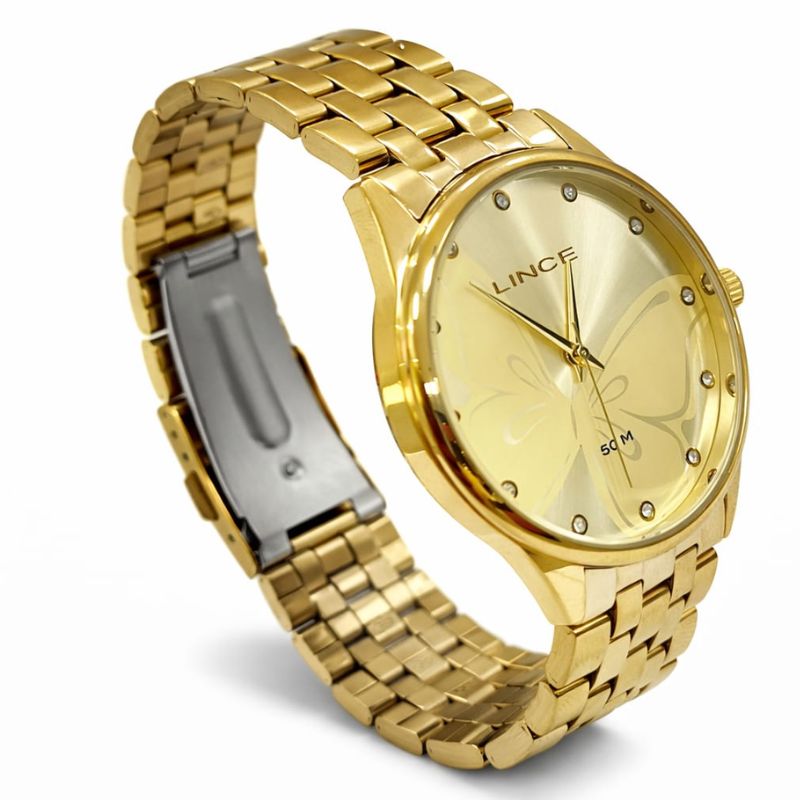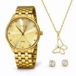 Kit Relógio Lince Analógico Dourado+ Gargantilha Borboleta